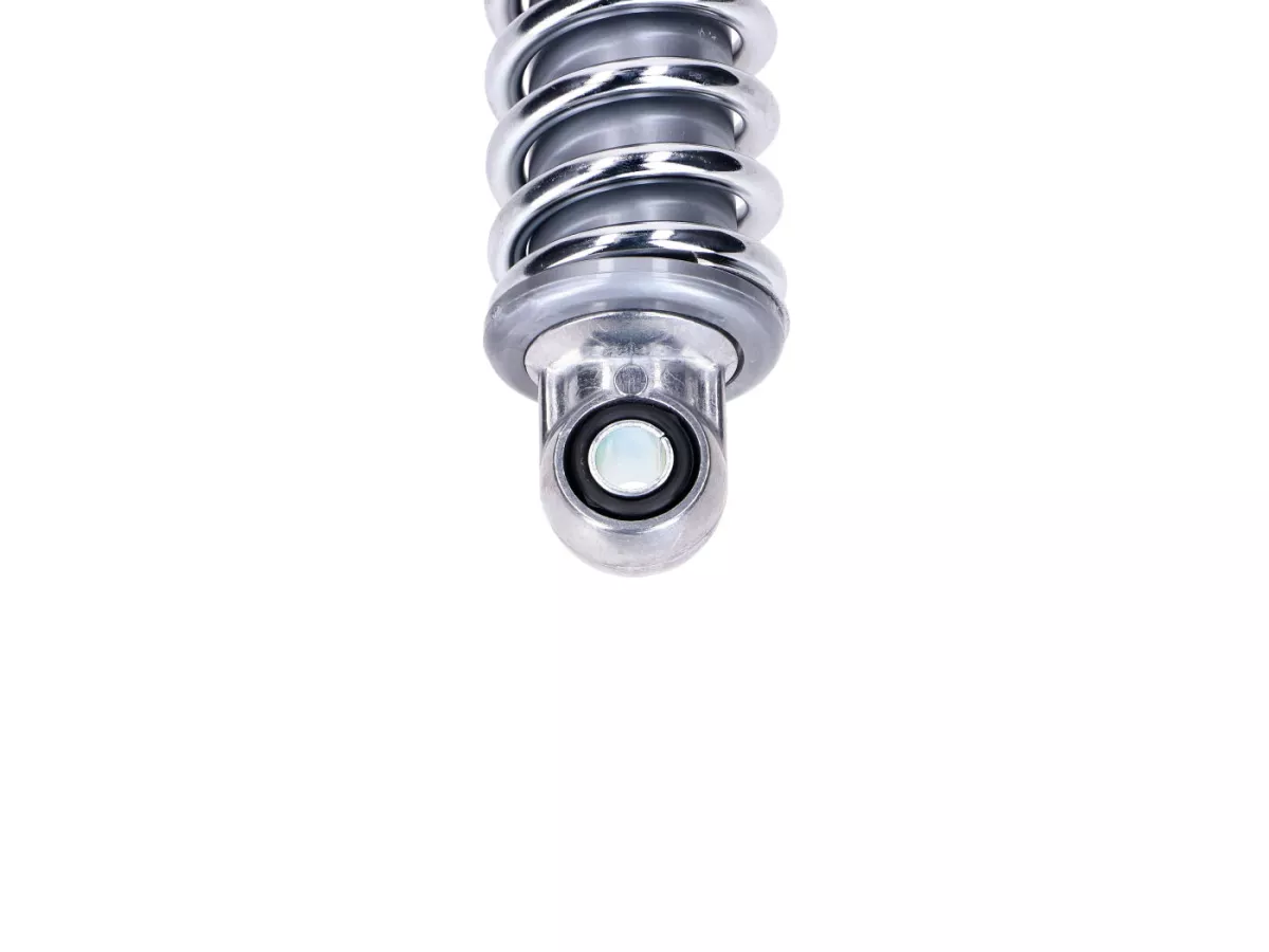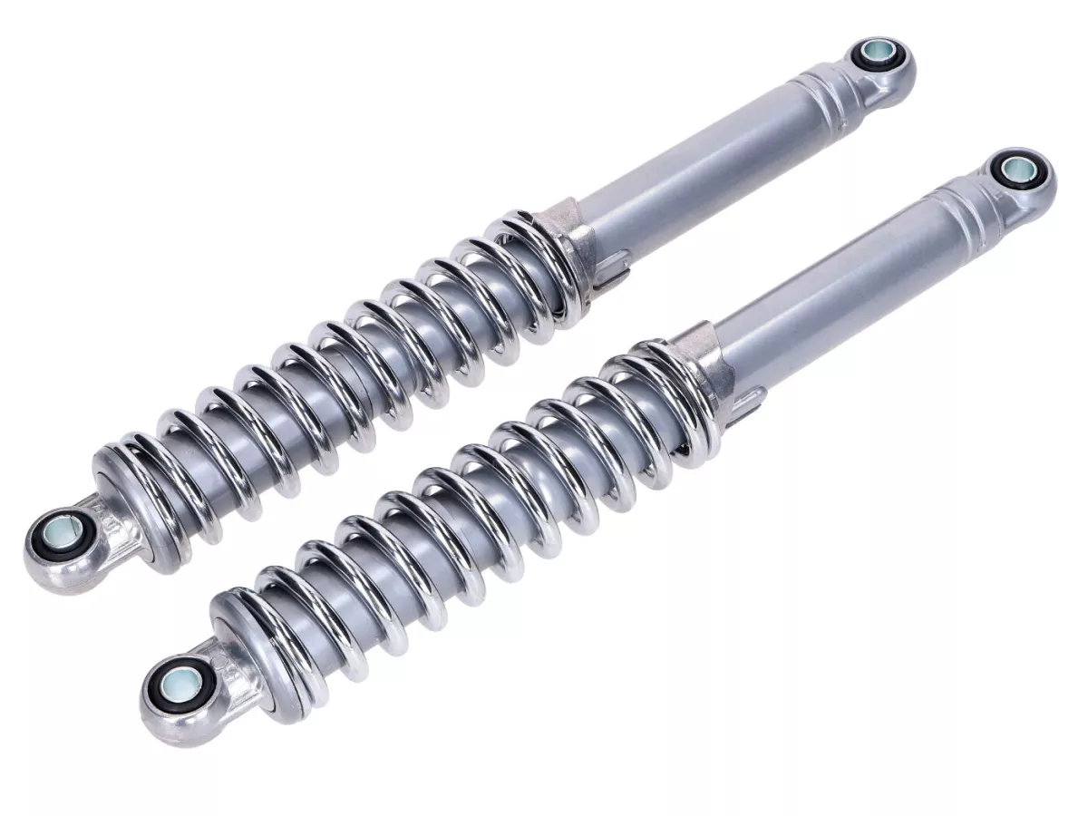 Grauer/verchromter und einstellbarer Stoßdämpfer Satz mit einer Länge von 340mm passend für viele Zündapp, Kreidler, Hercules und Puch Mofas, Mokicks und Mopeds.