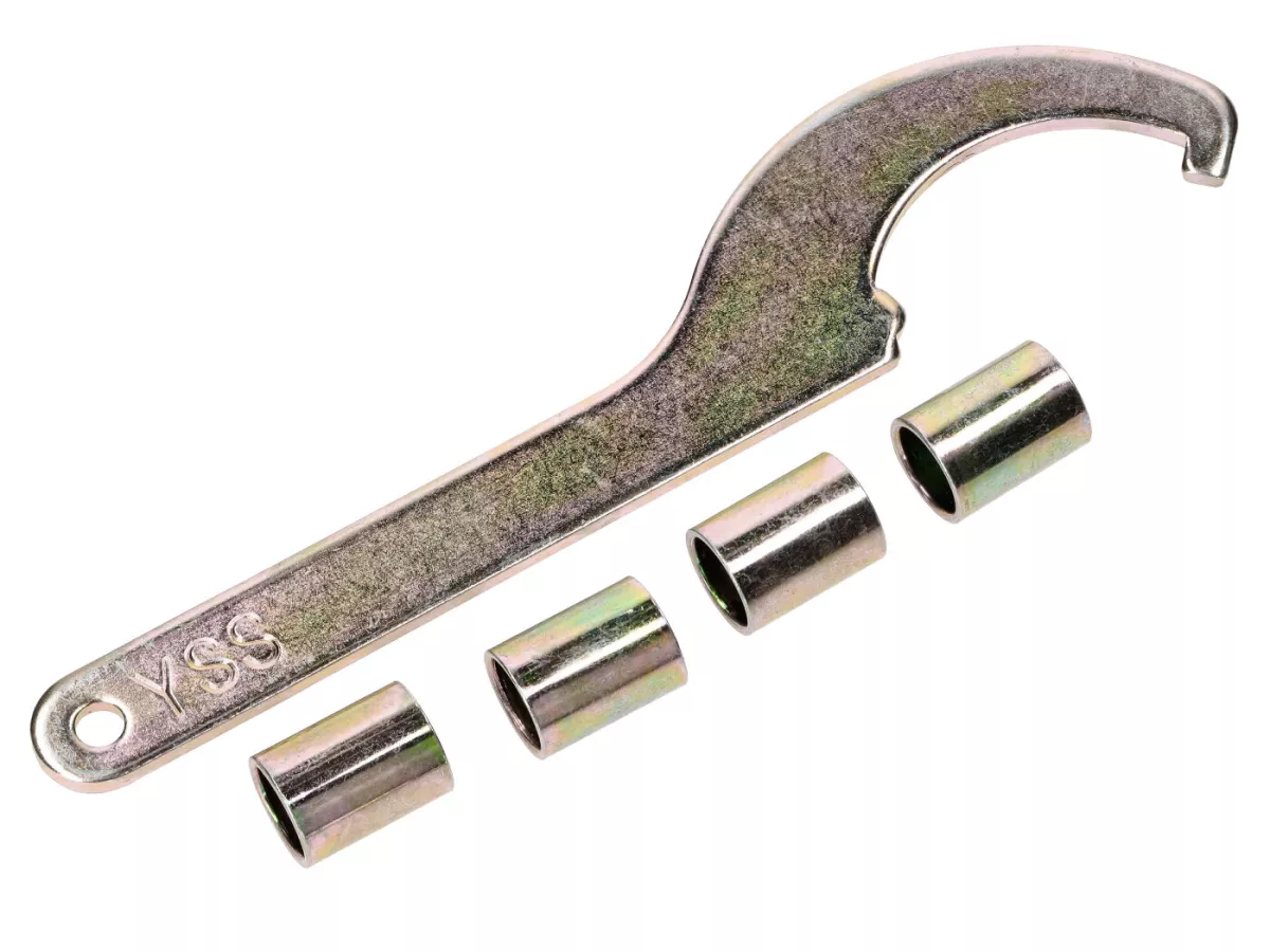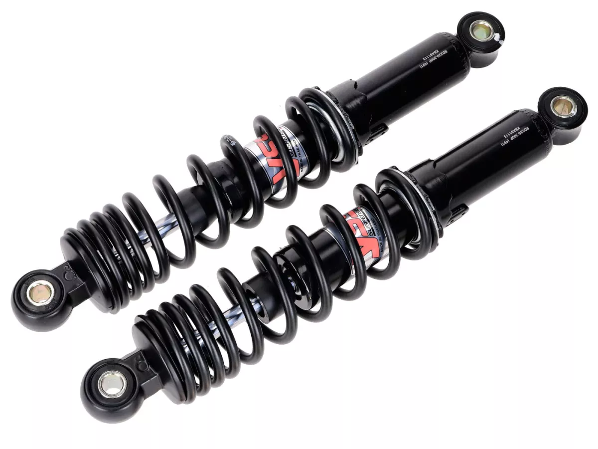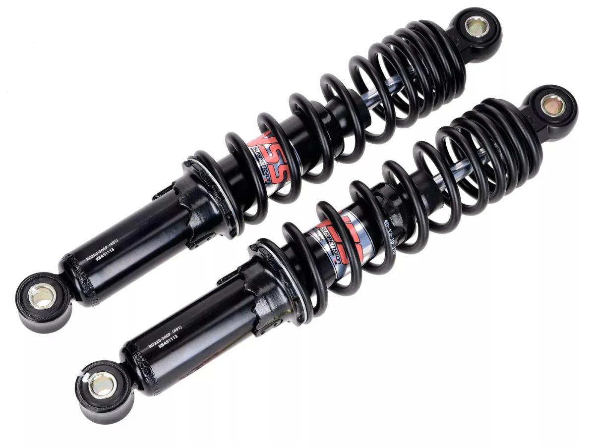 Hydraulisch gedämpfte, 5-fach verstellbare, progressive YSS Qualitäts-Federbeine mit einer Länge von 300mm (von Auge zu Auge) und 10mm Befestigungsbuchsen oben und unten. Inklusive Einstell-Hakenschlüssel und einem Satz 12mm Befestigungsbuchsen. Passend für Honda XL 50 S, CY 50 K und 80.