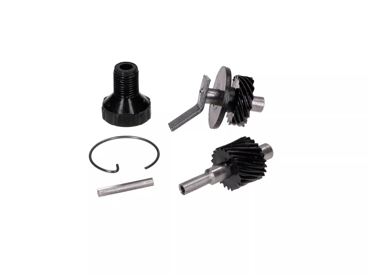 Kompletter Tachoantrieb inklusive Schraubenrad (15 Zähne), Schraubenritzel (22 Zähne), Lagerstück, Kerbstift und Sprengring passend für Kettenritzel mit 14 Zähnen für Simson Krafträder KR51/1 Schwalbe, SR4-1 Spatz, SR4-2 Star, SR4-3 Sperber, SR4-4 Habicht mit M52, M53 oder M54 Motor.