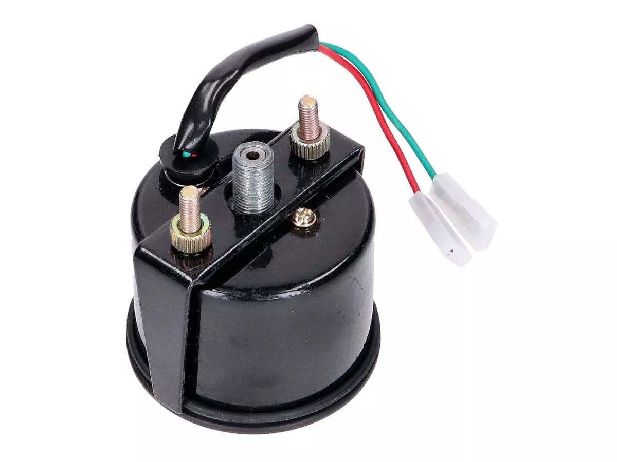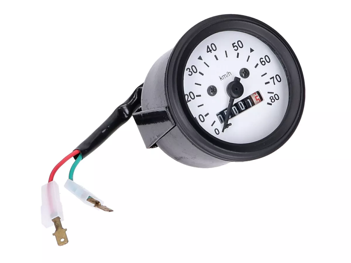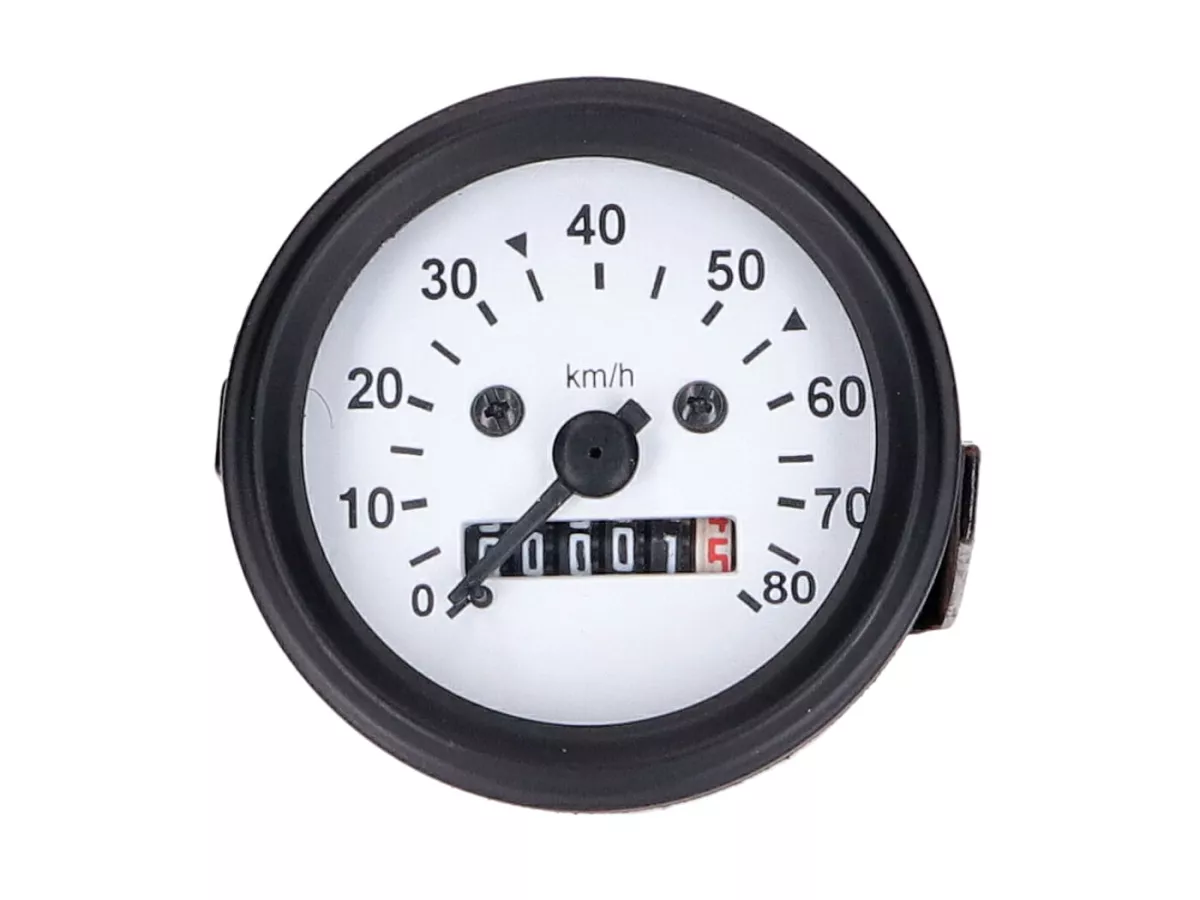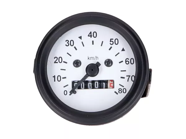 Ersatztachometer mit schwarzem Gehäuse und weißem Zifferblatt bis 80km/h für Mofas und Kleinkrafträder mit 60mm Tachoaufnahme.