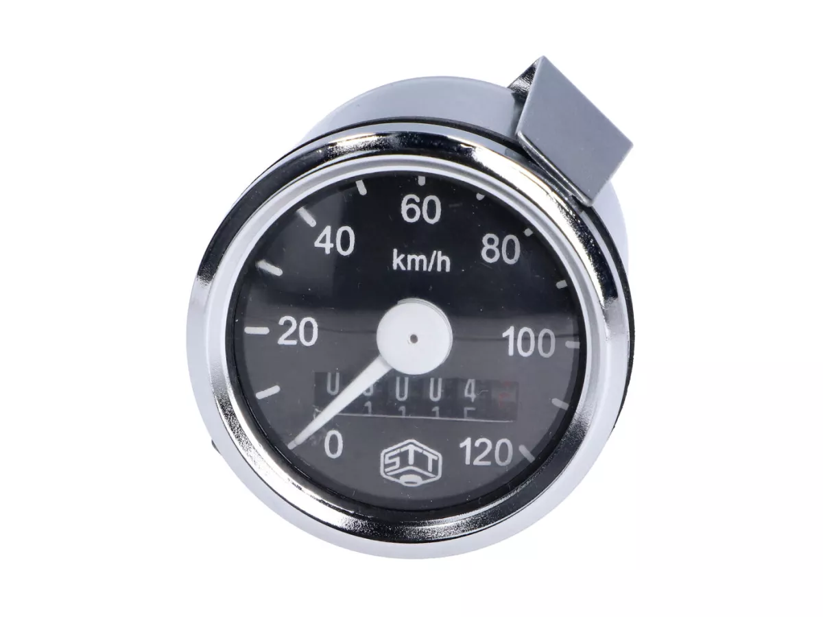 120km/h Tachometer von Schmitt in runder Ausführung mit schwarzem Zifferblatt und 48mm Einbaudurchmesser. Die Gehäuse-Bauhöhe beträgt 48mm. Der Tacho ist für Wellen mit M10x1 Gewinde geeignet und passend für Simson Moped / Mokick S50, S51, S70, KR51/1, KR51/2 Schwalbe, MZ GS oder Mofas wie Hercules.
