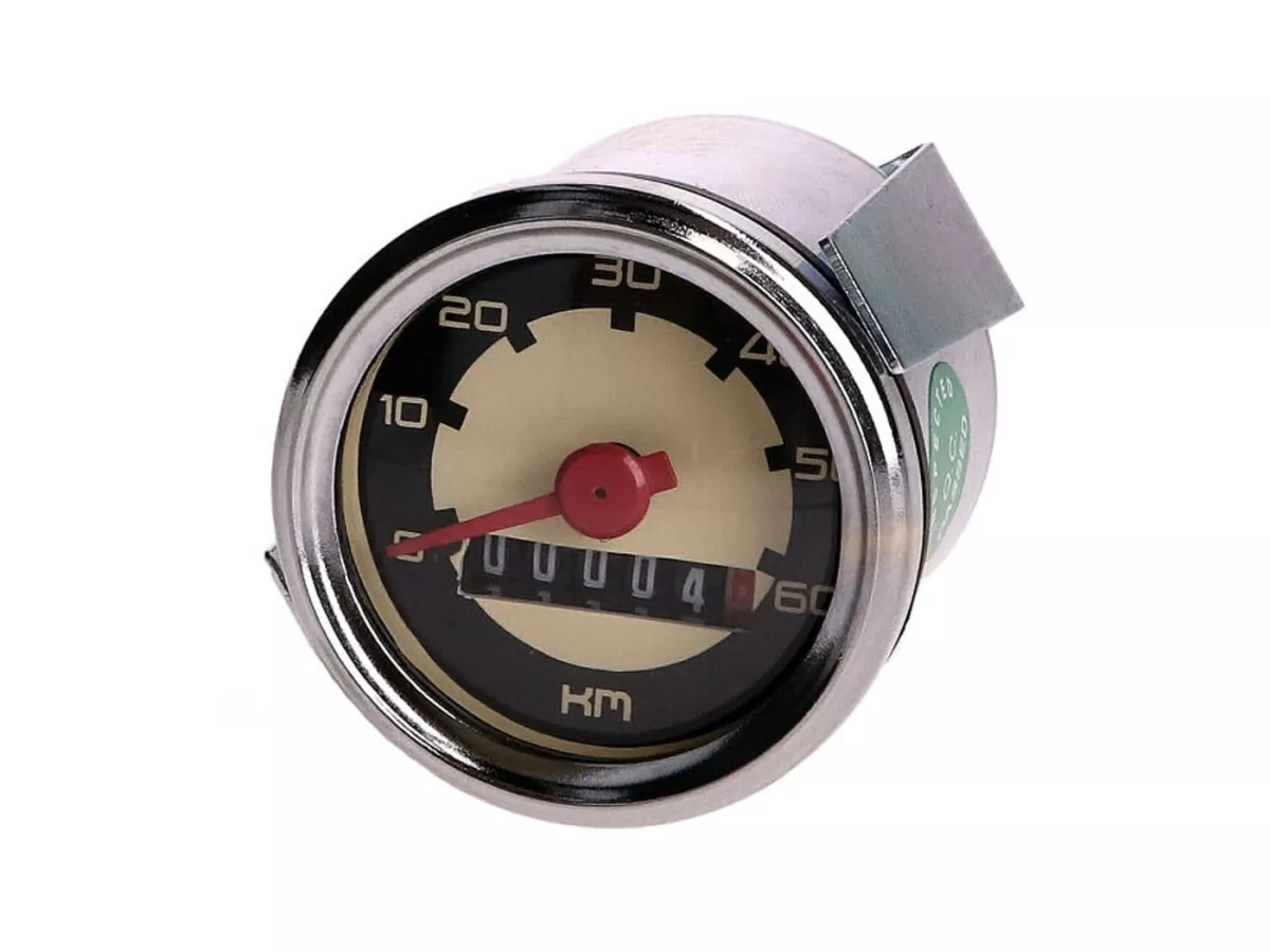 Mechanischer Tacho für Moped, Mokick oder Mofa. Weiße Tachoscheibe / Zifferblatt mit Anzeige bis 60km/h und Kilometer-Zähler.