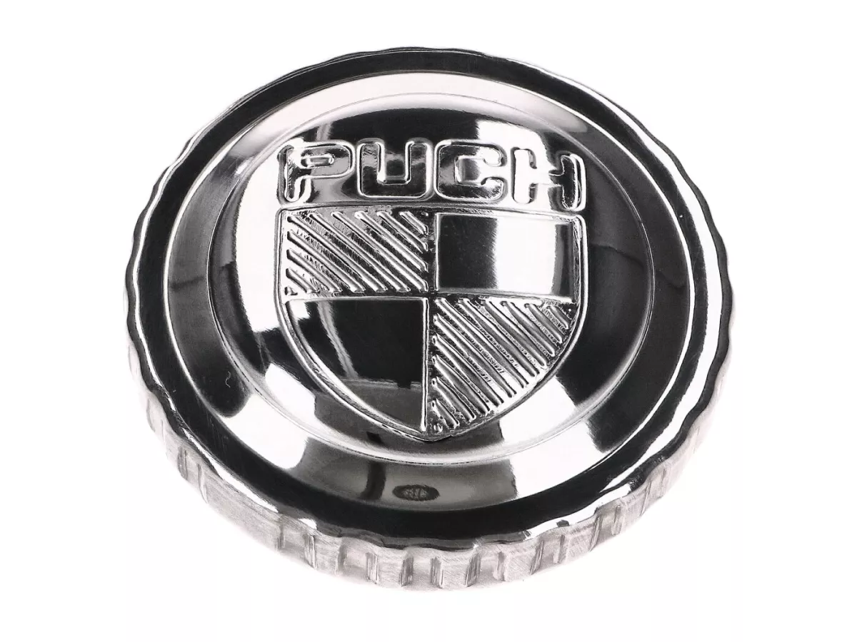 Verchromter Tankdeckel mit eingeprägtem Puch-Logo und Bajonettverschluss passend für Puch Maxi.