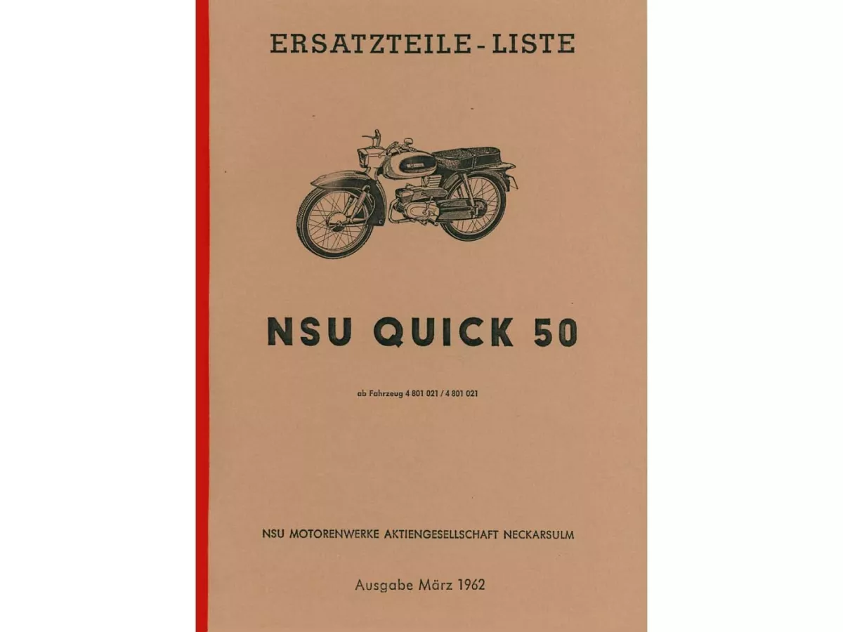 Teilekatalog NSU Quick50, März 1962, Fahrwerk- und Motorteile, Nachdruck, Top Qualität, DIN A4, 50 S., passend für NSU Quick50.