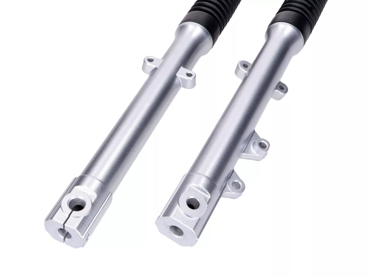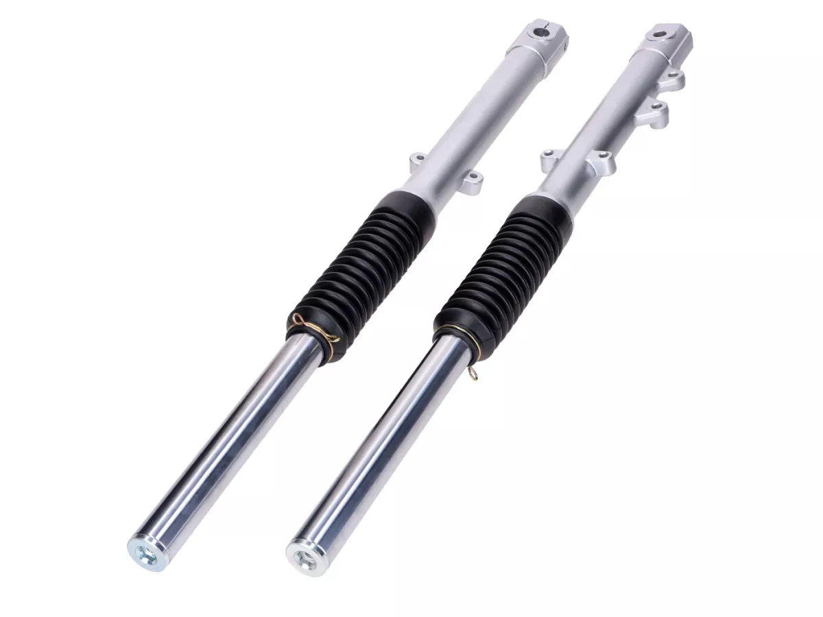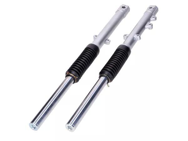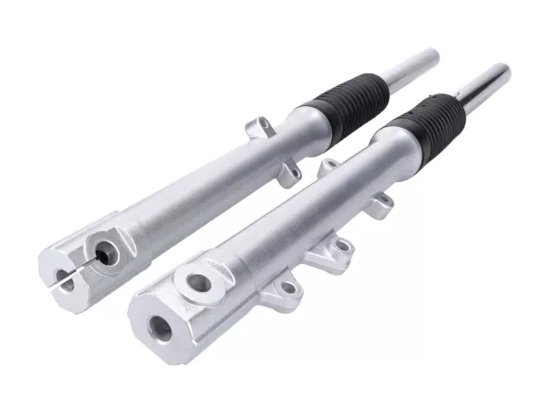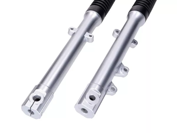 Silberfarbig lackierte Telegabel mit Aufnahme für einen Bremssattel für die Verwendung mit Scheibenbremsen passend für Simson S50, S51, S53, S70, S83.