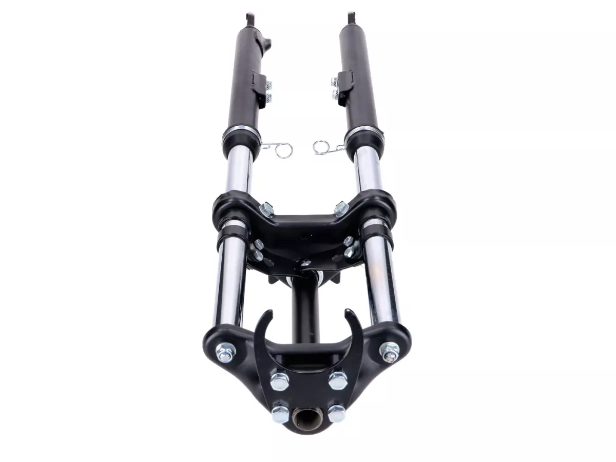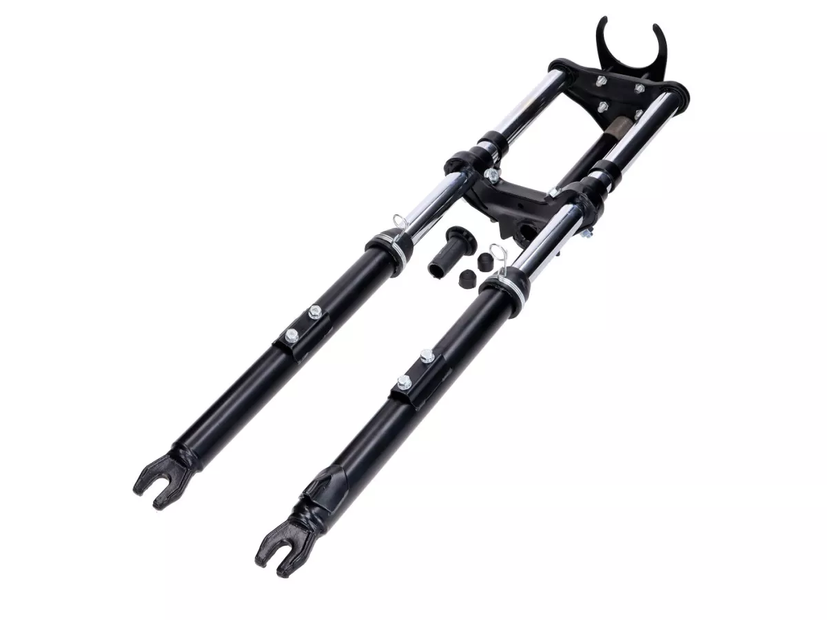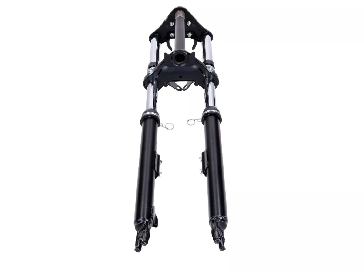 Schwarze Sport Telegabel, gefedert, passend für Peugeot 103 SP SPX Mofa Moped. Inklusive Schutzblech-, Lenker-, Scheinwerfer- und Tacho-Halter.