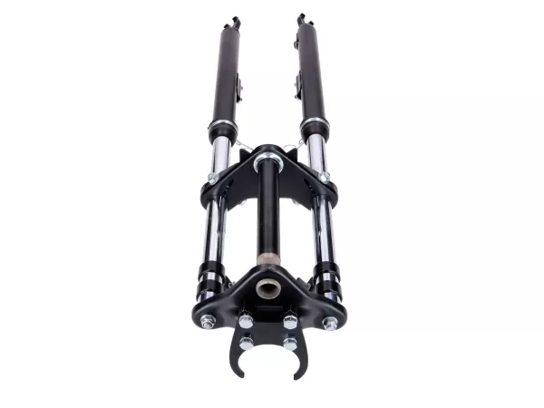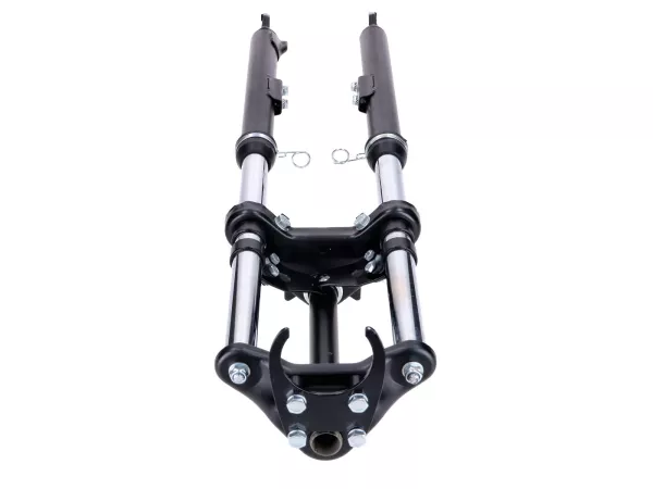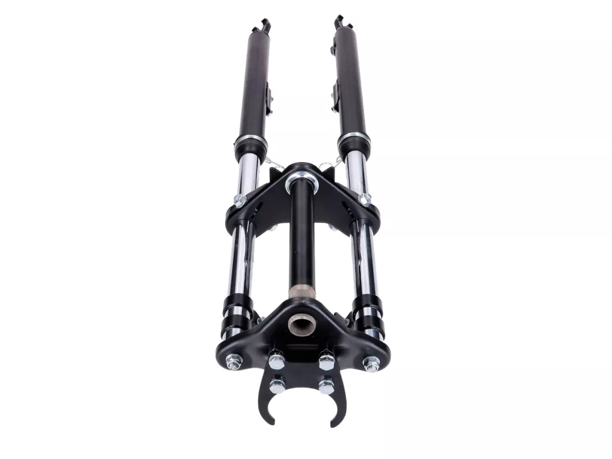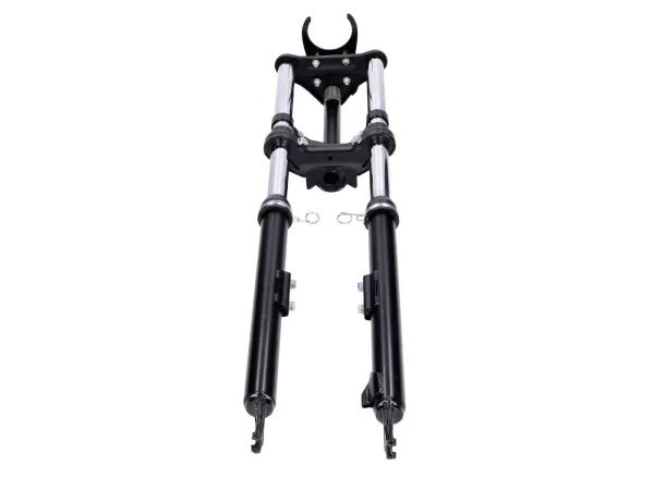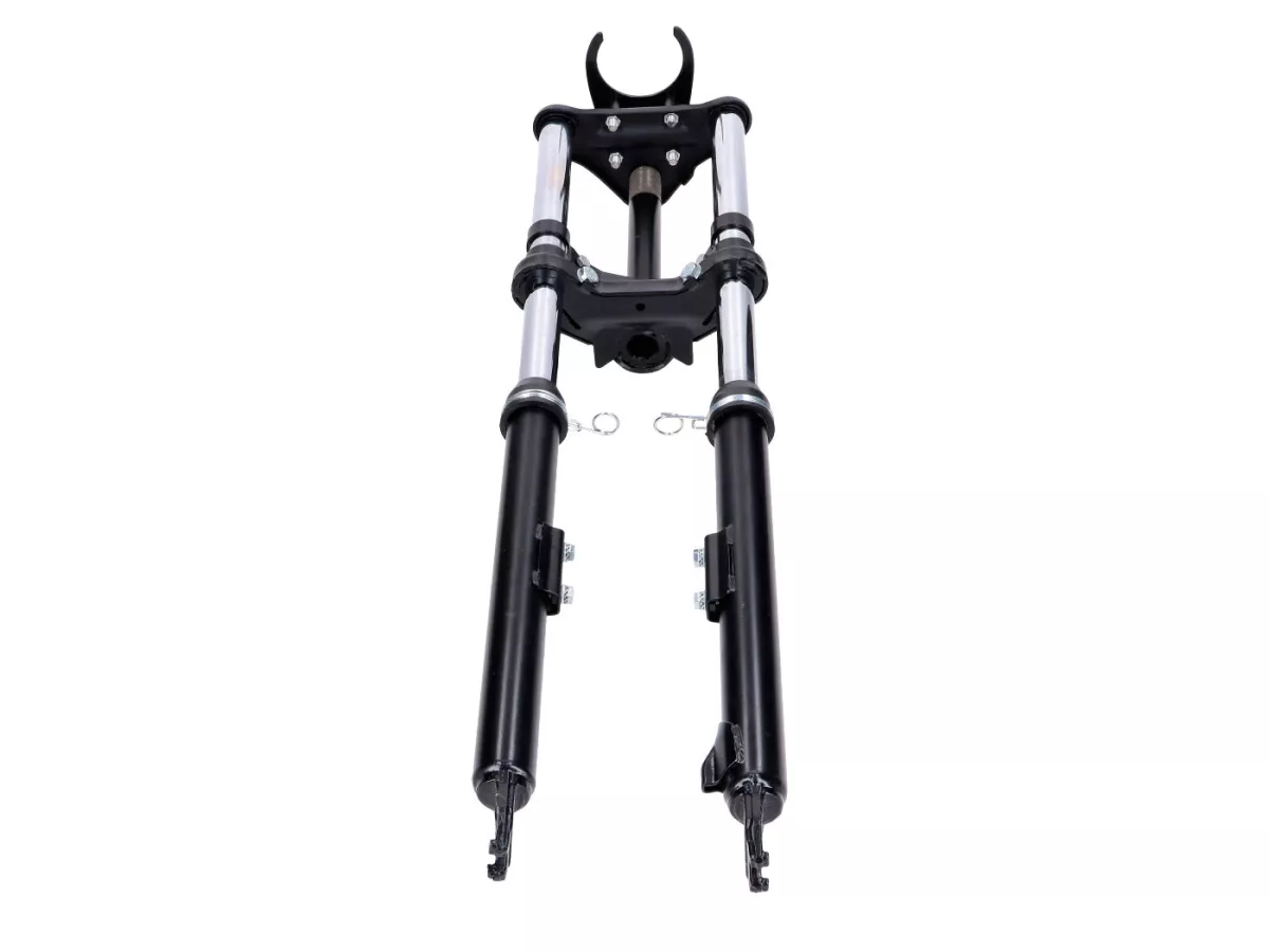 Schwarze Sport Telegabel, gefedert, passend für Peugeot 103 SP SPX Mofa Moped. Inklusive Schutzblech-, Lenker-, Scheinwerfer- und Tacho-Halter.