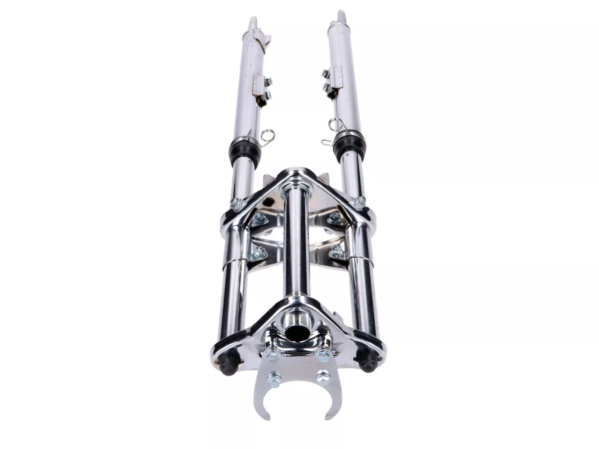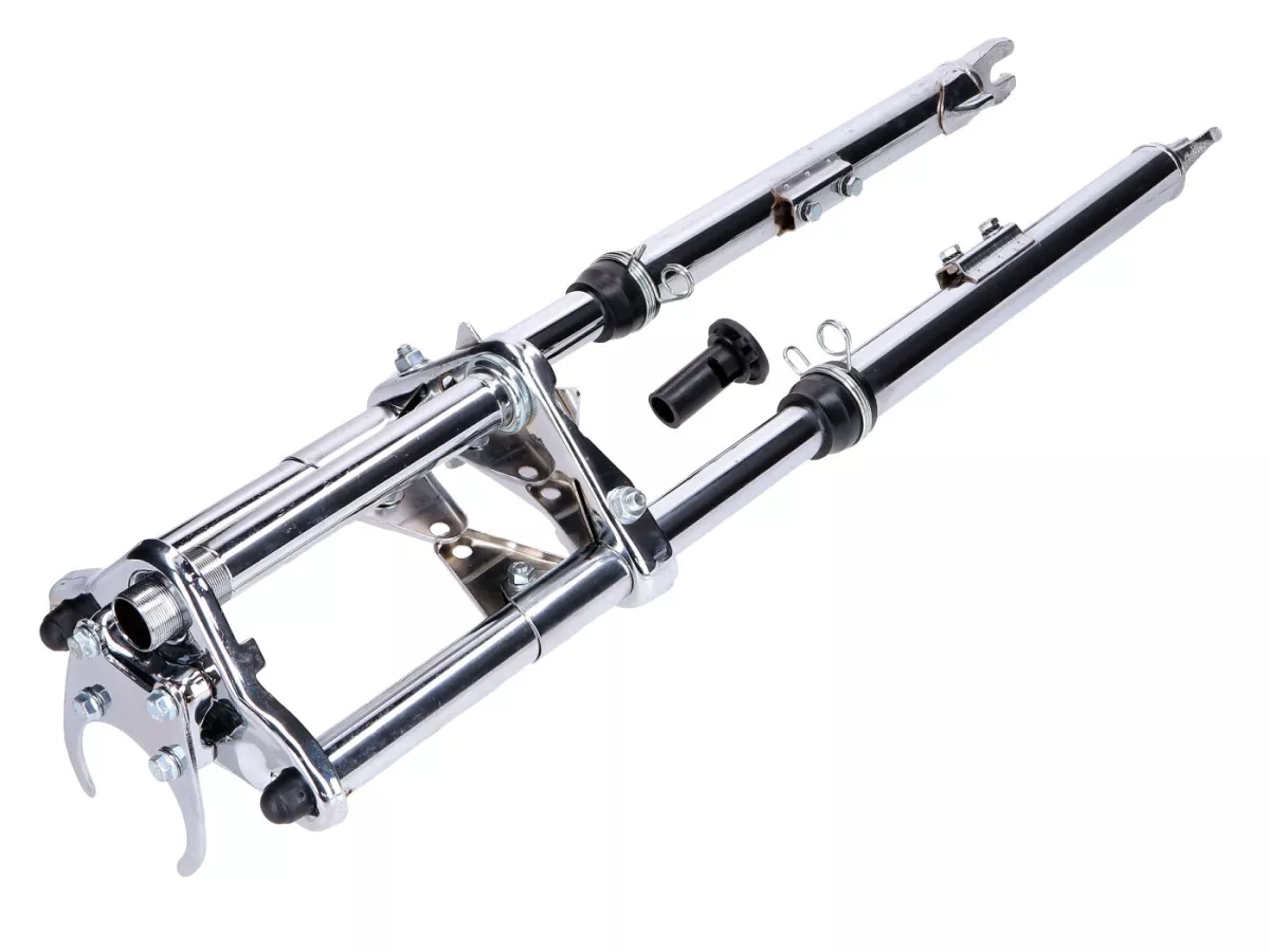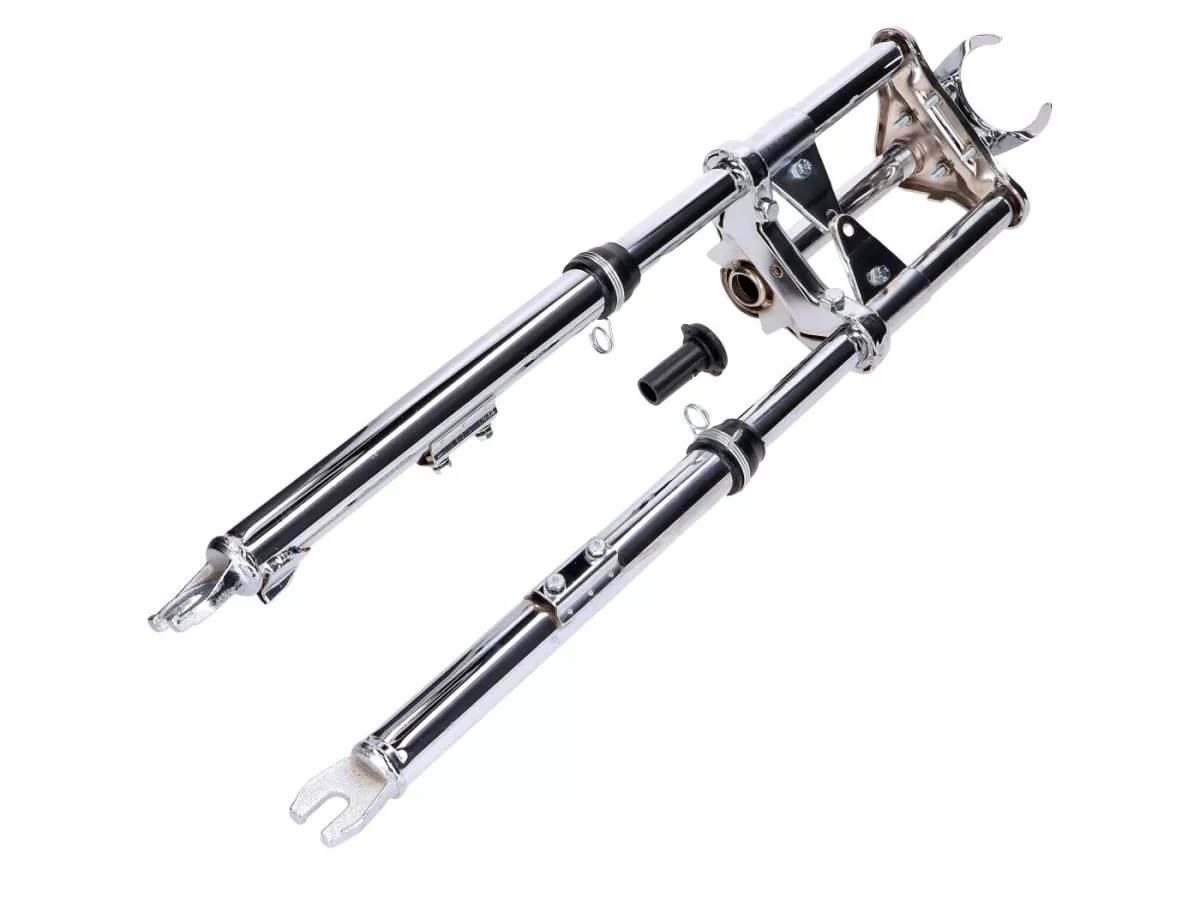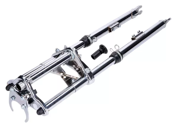 Verchromte Sport Telegabel, gefedert, passend für Peugeot 103 SP SPX Mofa / Moped. Inklusive Schutzblech-, Lenker-, Scheinwerfer- und Tacho-Halter.