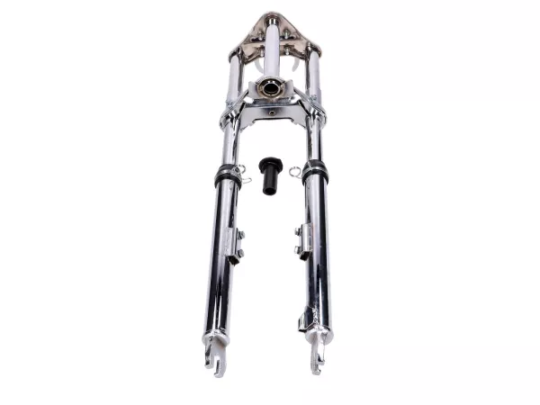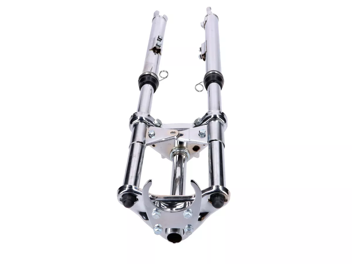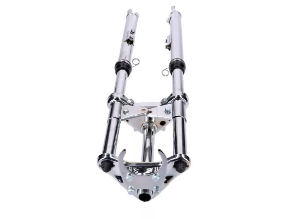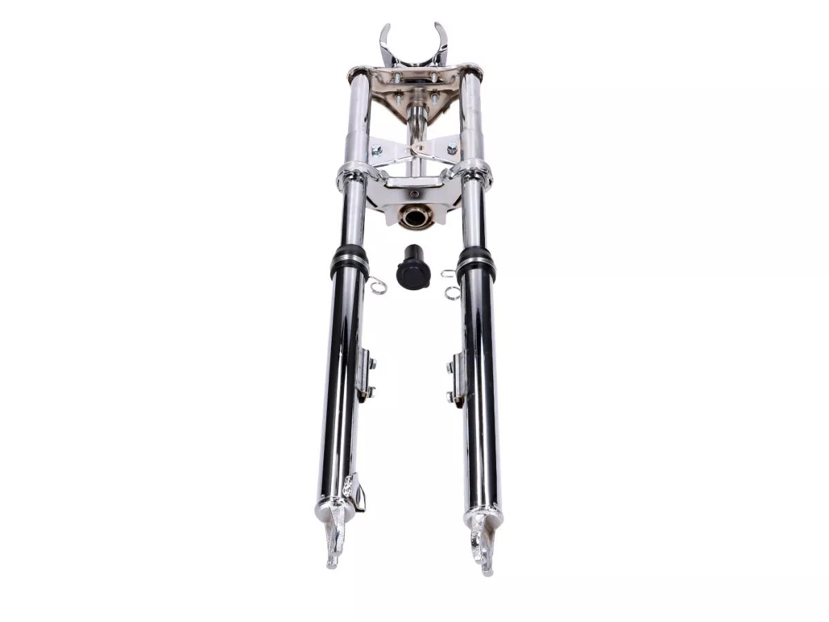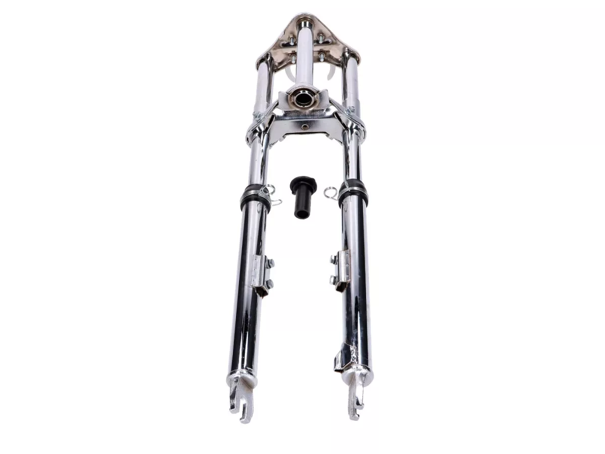 Verchromte Sport Telegabel, gefedert, passend für Peugeot 103 SP SPX Mofa / Moped. Inklusive Schutzblech-, Lenker-, Scheinwerfer- und Tacho-Halter.