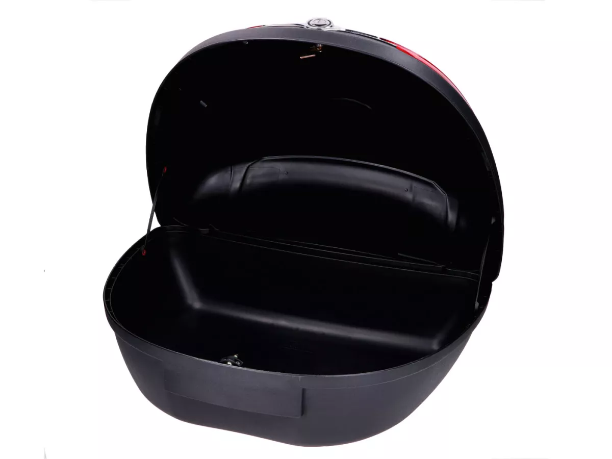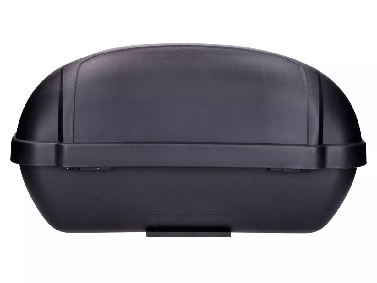 Universeller Top Case Koffer mit 51 Liter Fassungsvermögen aus schwarzem, belastbarem Kunststoff. Sorgt mit den zwei roten Reflektoren für gute Sichtbarkeit.