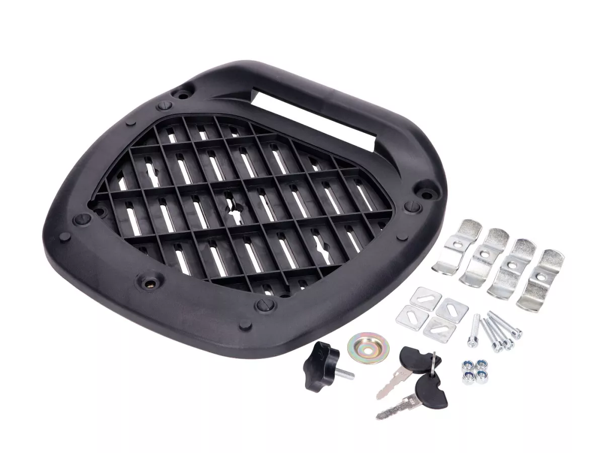 Der Koffer wird mit zwei Schlüsseln und einer Montagegrundplatte geliefert. Die Montagegrundplatte muss auf einen vorhandenen Gepäckträger oder Topcaseträger montiert werden.