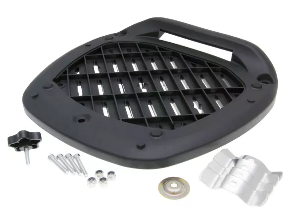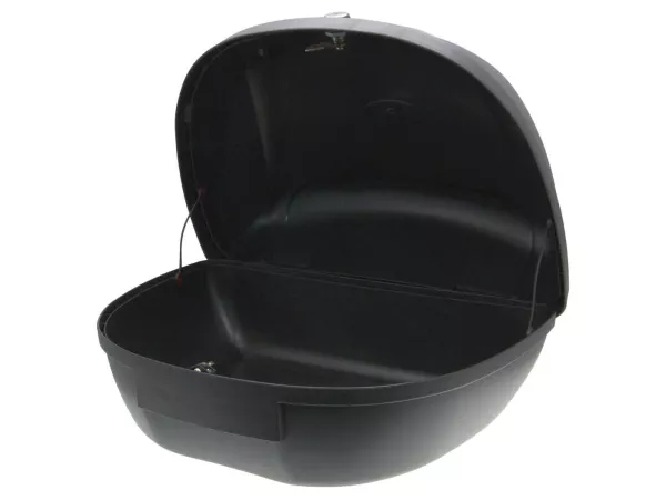 Universeller Top Case Koffer. Schwarz durchgefärbter, belastbarer Kunststoff mit 51 Liter Fassungsvermögen. Passend für 2 Integralhelme. Wird mit zwei Schlüsseln und Montagegrundplatte geliefert. Die Montagegrundplatte muss auf einen vorhanden Gepäckträger oder Topcaseträger montiert werden. Der Koffer ist abnehmbar, die Grundplatte bleibt fest mit dem Fahrzeug verschraubt.