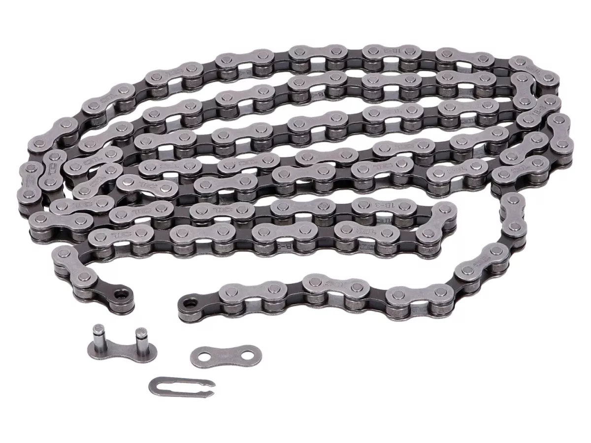 Universal-Ersatzkette 1/2" x 1/8", 112 Glieder, Teilung 410. Die Kette muss unter Umständen auf die richtige Länge eingekürzt werden. Passend zum Tretwerk diverser Mofas.