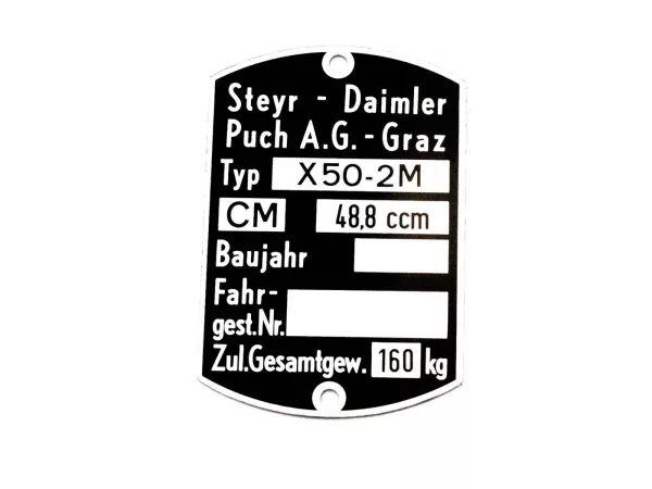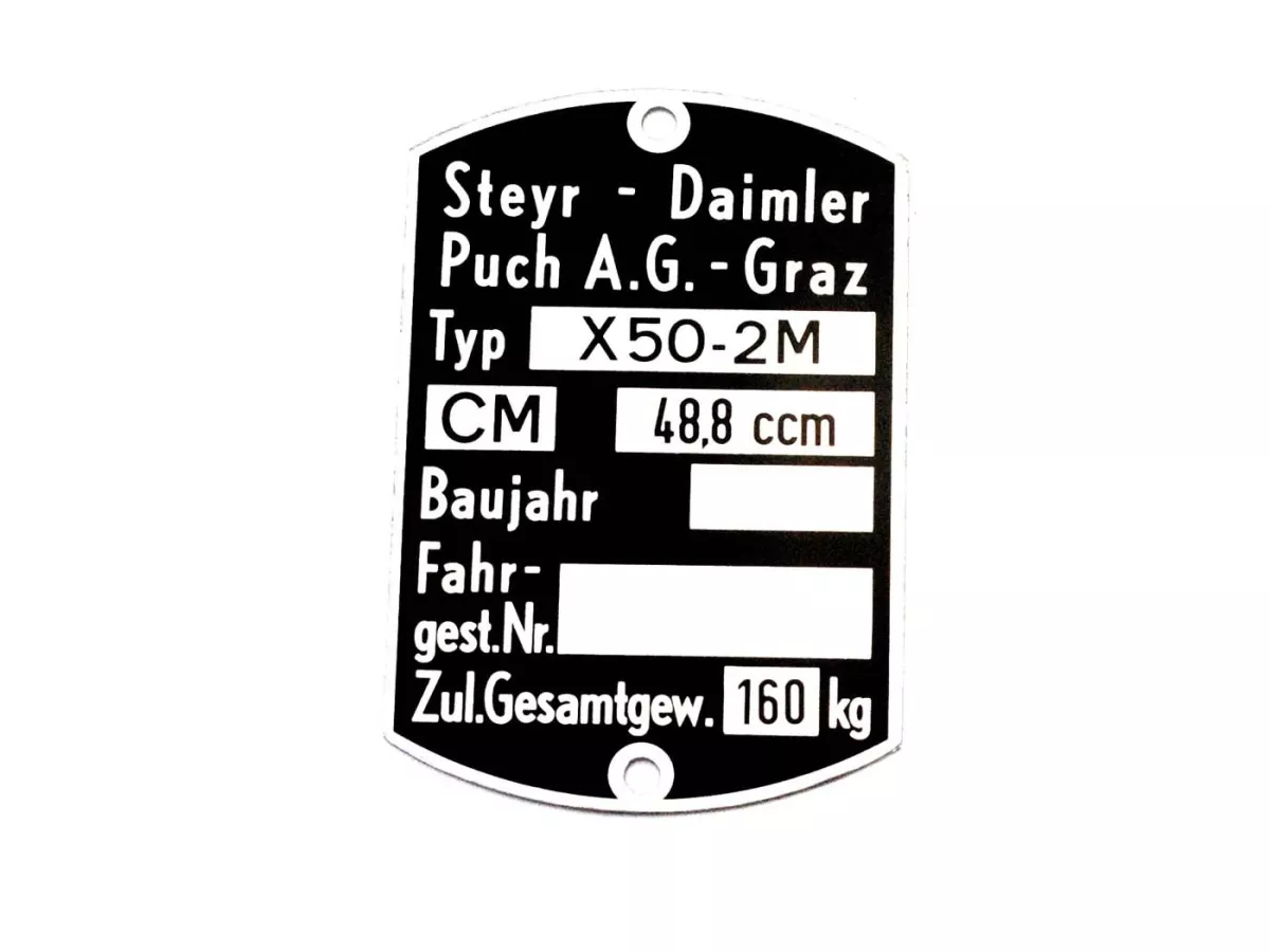Rahmen Typenschild Blanko (ohne Nummer) passend für Puch X 50-2M, Maße: 59 x 40mm, Original Puch Ersatzteil aus altem Lagerbestand in Top Qualität. Nur solange der Vorrat reicht.