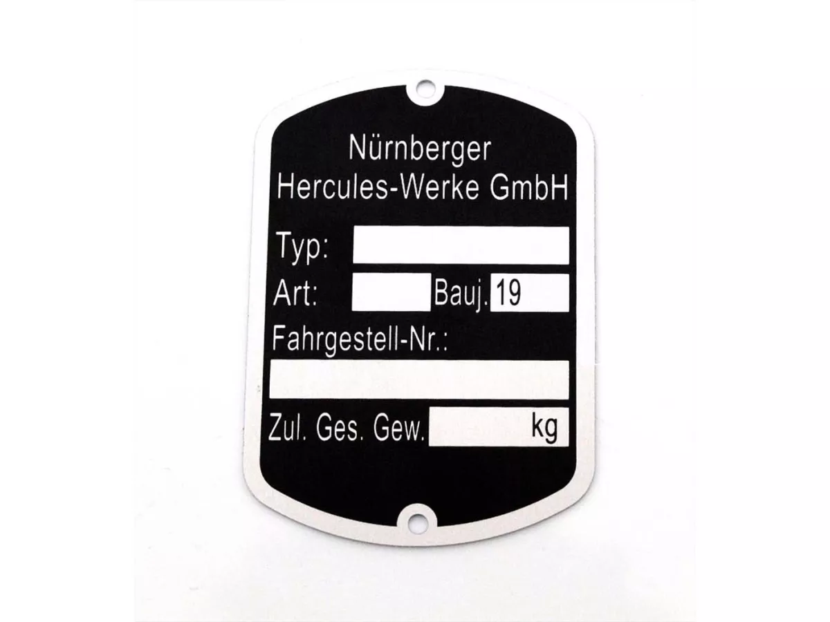 MOGA Blanko Typenschild in Top Qualität, hergestellt in Deutschland, passend für viele Hercules Mofa Moped Mokick Modelle wie Prima 1-6, Prima GT, GX, Presto, Pronto, KX 5, Supra 2 D, Optima, MX 1, MF, MP, M 1-5, P 1-3, HR 1. Maße: Höhe ca. 50mm, Breite ca. 35mm, Befestigungslochabstand ca. 45mm. Vergleichsnummer: 504 947 00 01. Vor dem Kauf unbedingt die Maße überprüfen.