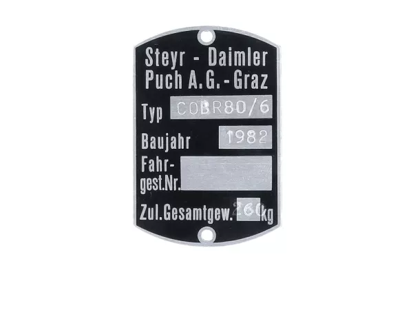 Original Rahmen Typenschild Blanko, passend für Puch N 50, Maße: 60x40mm. Original Puch Ersatzteil, Top Qualität, begrenzter Vorrat.