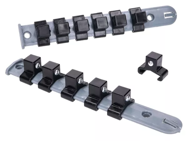 Zwei Stück praktische Wandleisten aus Kunststoff für Steckschlüsseleinsätze mit 1/2-Zoll-Antrieb. Insgesamt 12 Steckplätze auf zwei Leisten verteilt. Sicherung über verschiebbare Klammern mit Kugelrastung.
