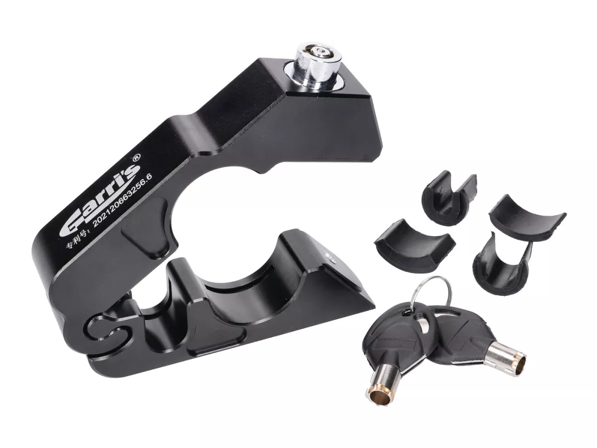 Effektives, einfach anzubringendes Schloss bzw. Wegfahrsperre: Die Vorderradbremse wird auf Druck mit dem Gasgriff verbunden und verhindert die Inbetriebnahme bzw. das Wegschieben des Fahrzeuges. Im Vergleich zu einem Bremsscheibenschloss sicher die elegantere und vor allem praktischere Lösung, da ein Bremsscheibenschloss gern auch mal vom Fahrzeugeigentümer vergessen wird.