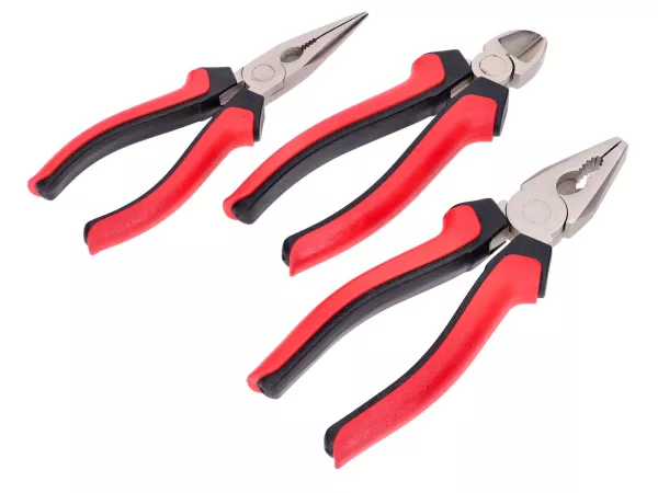 3-teiliges Set der Marke Silverline, bestehend aus Telefonzange, Kombizange und einem Seitenschneider. Die Zangen besitzen vergütete Backen mit induktionsgehärteten Schneidkanten und geformten Kunststoffgriffen mit Abgleitschutz.