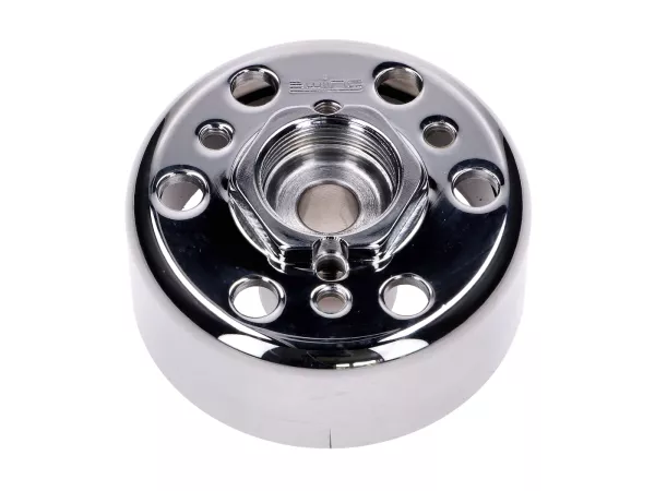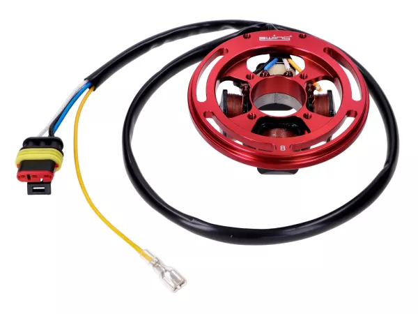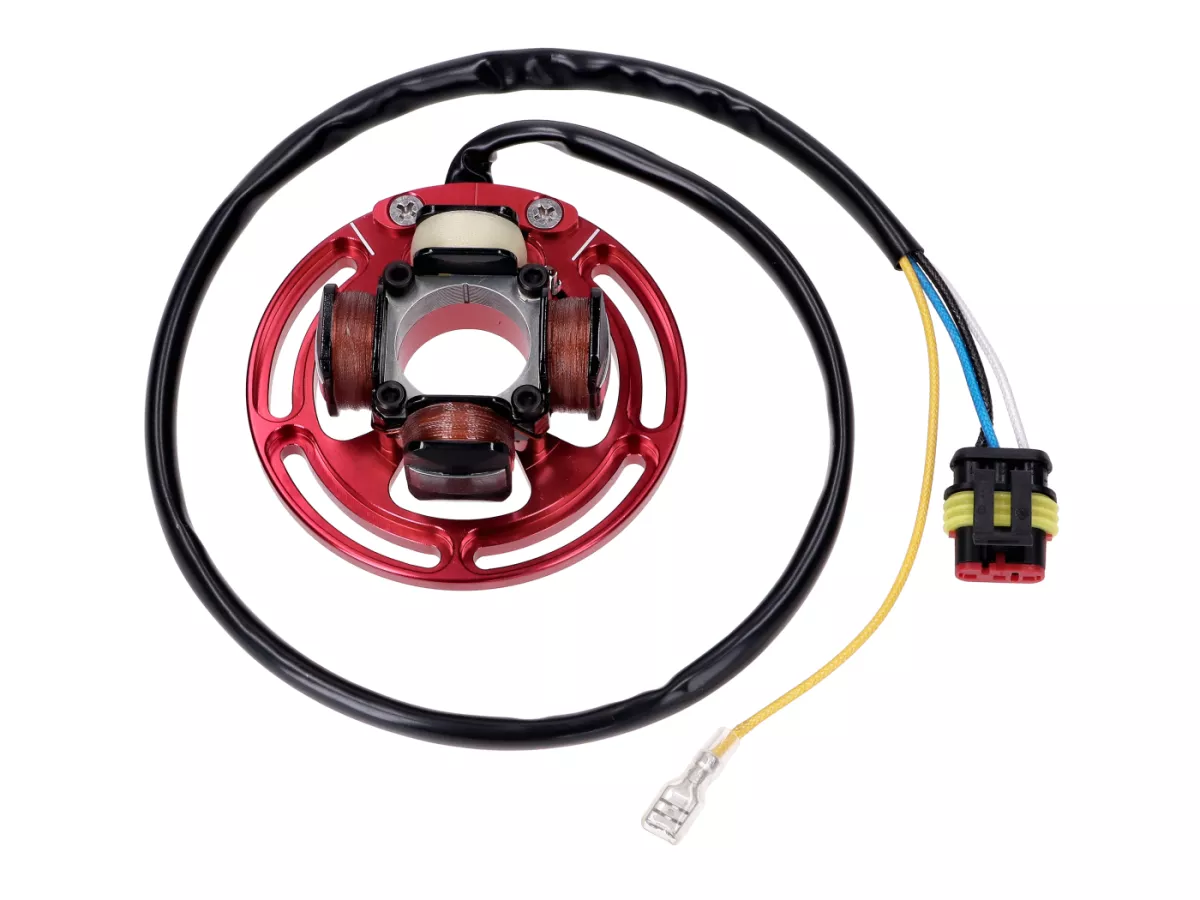Die Zündung verfügt ab Werk über mehr Schwungmasse als HPI-Systeme (382g) und sorgt dadurch für einen ruhigeren Motor-Leerlauf. Das fein gewuchtete Schwungrad reduziert Vibrationen deutlich. Dank des Abzugsgewindes mit M26x1,5-Steigung können handelsübliche Bosch- oder Ducati-Schwungradabzieher verwendet werden. Außerdem ist die Einstellung des Zündzeitpunktes vereinfacht und die Zündkurve (Verstellung 12° - 14°) optimiert. Der Stator ist für hohe Hitzebelastungen ausgelegt.