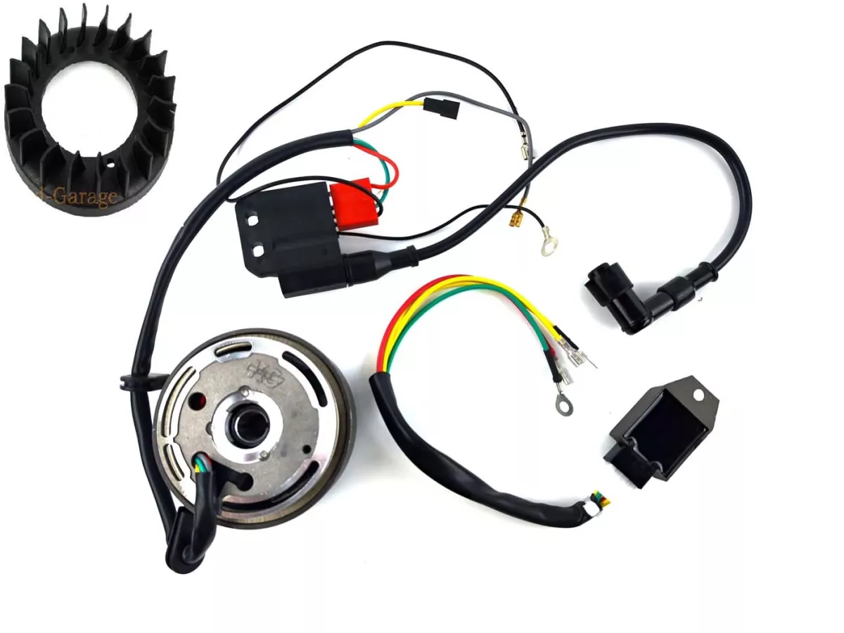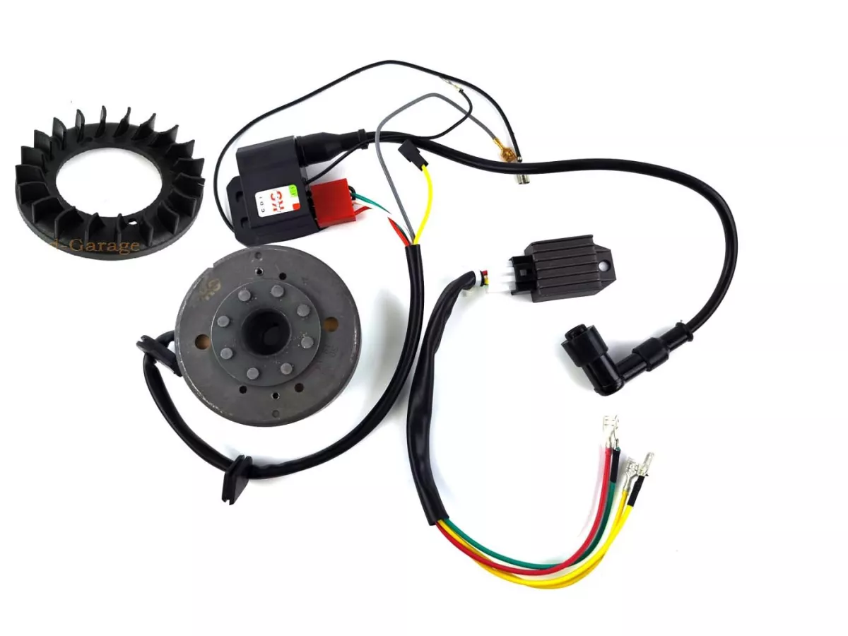 6 Volt Kokusan EVO 2 Sternzündung geeignet für gebläsegekühlte und luftgekühlte Kreidler Florett Modelle wie Eiertank LF LH usw. Sie besteht aus einer Grundplatte mit Pick up, einem Polrad mit Gebläseaufsatz, einer CDI Steuereinheit, einem Regler, einem Kabelbaum und einer Einbauanleitung/Schaltplan. Die Spannung beträgt ca. 6 Volt und die Leistung liegt bei ca. 70 bis 80 Watt. Bei luftgekühlten Fahrzeugen muss lediglich das Lüfterrad demontiert werden. Die Maße der Grundplatte betragen 90mm mit einem Konus von 15/11mm.