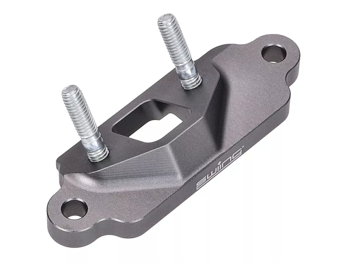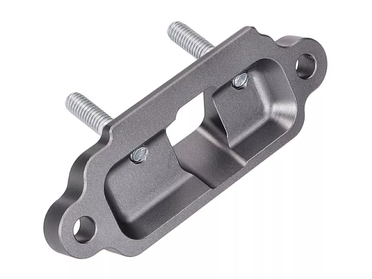 Zwischenflansch / Membranblock zur Montage für einen 17mm SSB-Vergaser. Aus CNC-gefrästem Aluminium mit 18x14mm Einlassfenster. Die Stehbolzen sind mit Loctite gesichert.