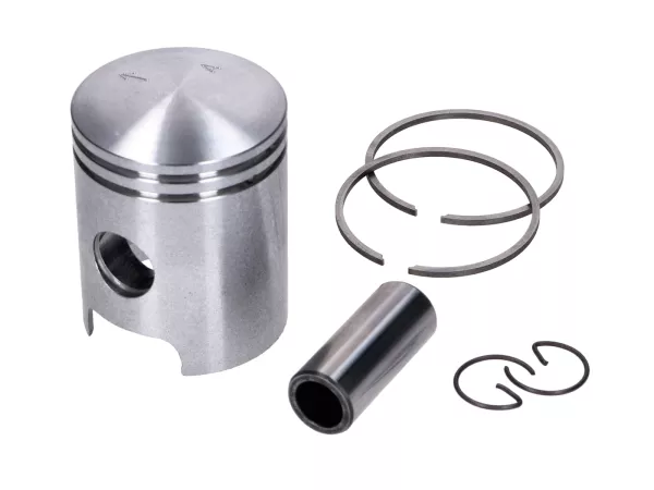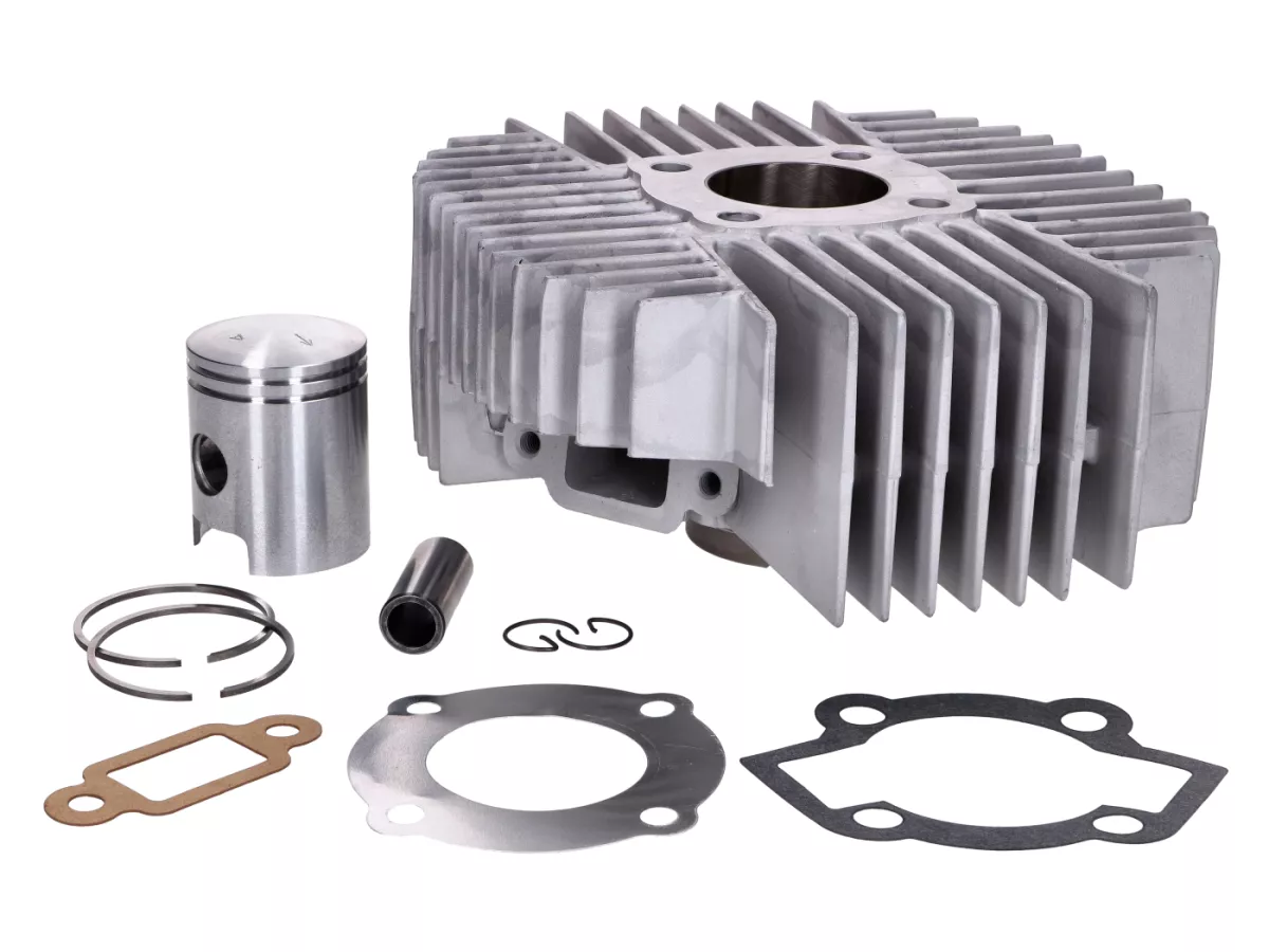 Das Kit besteht aus Zylinder, Kolben, Kolbenringen, Kolbenbolzen, Sicherungsringe sowie Einlassdichtung, Zylinderkopf- und Zylinderfußdichtung.