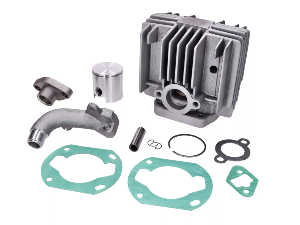 Das leistungssteigernde Kit kommt mit einem hochwertigen Aluminiumzylinder mit vergrößerter Bohrung, einem Kolben inkl. Kolbenbolzen und Ringen, allen erforderlichen Dichtungen sowie zwei Ansaugstutzen. Es sind keine Veränderungen am Motorgehäuse notwendig.