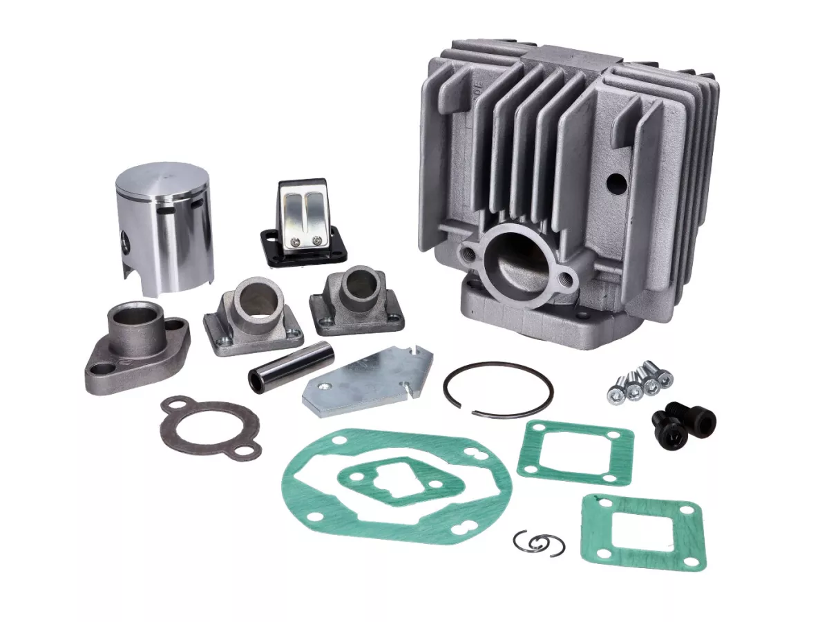 Das Zylinderkit enthält einen Aluminiumzylinder mit vergrößerter Bohrung, den kompletten Kolbensatz mit Kolbenbolzen und Ringen, Membranventil, Auspuffkrümmer und alle notwendigen Dichtungen.