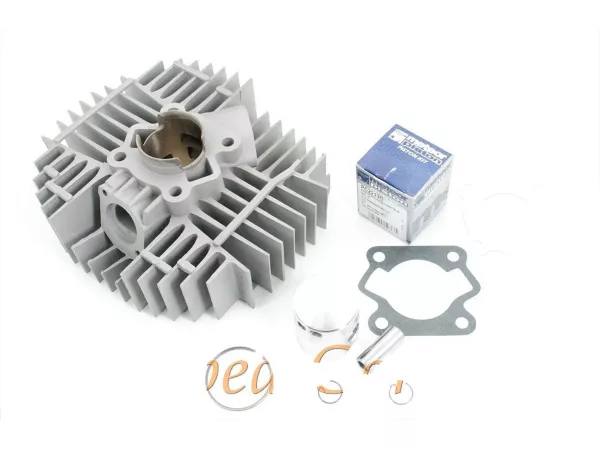 Supertherm Aluminium 60ccm Zylinder Satz mit Nickasil-Beschichtung und zusätzlichen Überstromkanälen, Meteor Kolben mit Fenster, für maximale Leistung und Drehzahl von Voskamp in Holland überarbeitet. Passend bei Kreidler Florett RS und anderen mit großem Stehbolzenabstand. Einlass schräg, Stehbolzenabstand 55mm. Inklusive kompletter Dichtsatz, Bohrung 44mm, Krümmeranschluss 32mm Flansch, Verschraubung ca. 50mm, Ansaugstutzen Lochabstand ca. 48mm. Kolbenring 00064699. Anpassungsarbeiten am Zylinder oder Motor sowie eine einheitliche Tuningmaßnahme erforderlich. Tuningteil für Rennstreckenbetrieb, nicht STVZO-konform. Keine Gewährleistung auf Tuningteile.