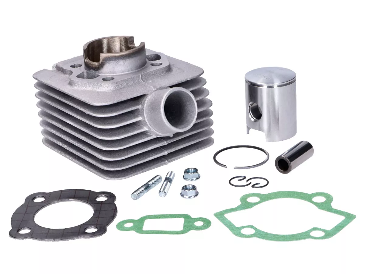 Leistungsstarker, luftgekühlter 50ccm Zylinder aus Aluminium mit Nickel-Silizium-Karbid beschichteter Laufbuchse und 1-Ring Racing Kolben. Kleinteile und Zylinderdichtungen sind im Kit enthalten.