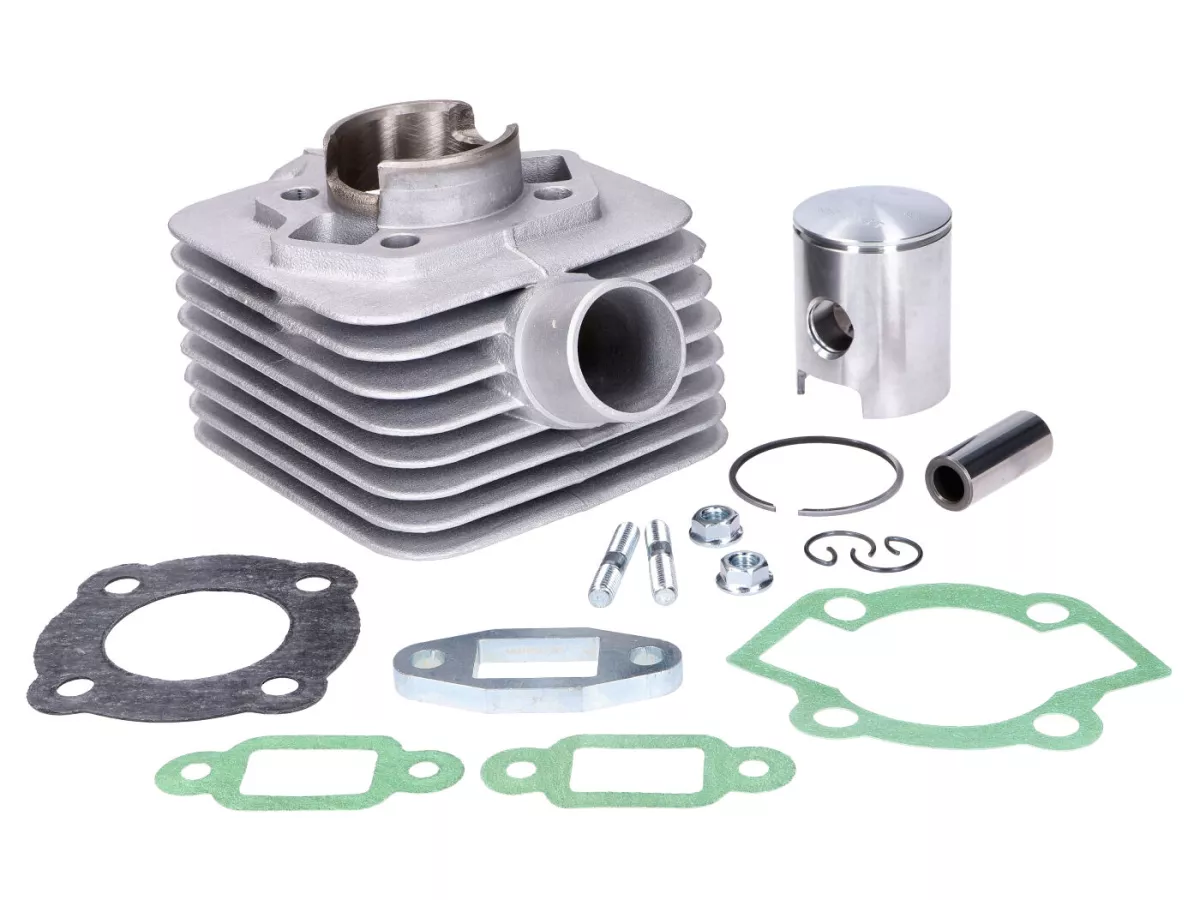 Leistungsstarker, luftgekühlter 50ccm Zylinder aus Aluminium mit Nickel-Silizium-Karbid beschichteter Laufbuchse und 1-Ring Racing Kolben. Kleinteile und Zylinderdichtungen sind im Kit enthalten.