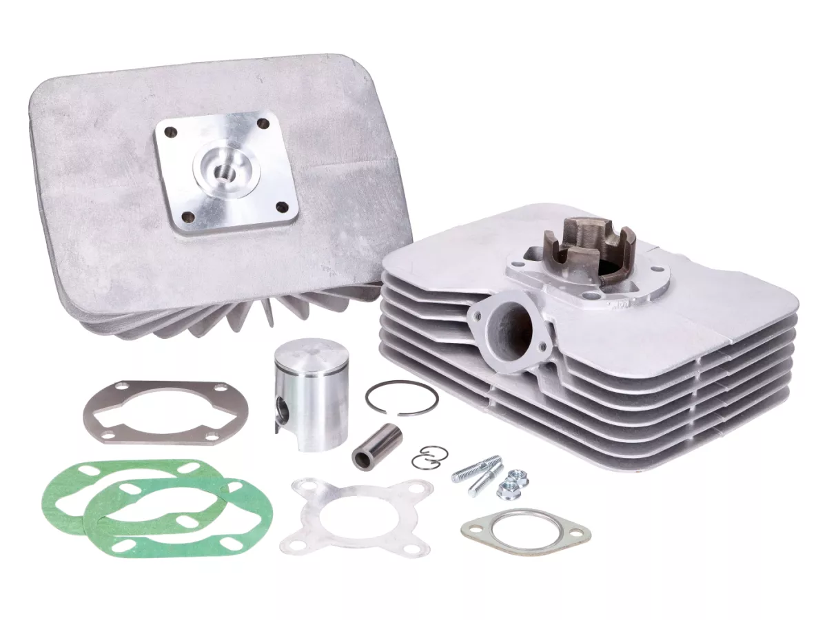 Zylinderkit vom italienischen Hersteller Parmakit aus Aluminium mit 50ccm Hubraum, Bohrung d=40mm, KB=14mm mit Fächerkopf passend für Hercules GT, K50, RLC, Ultra, Sachs RS 50.