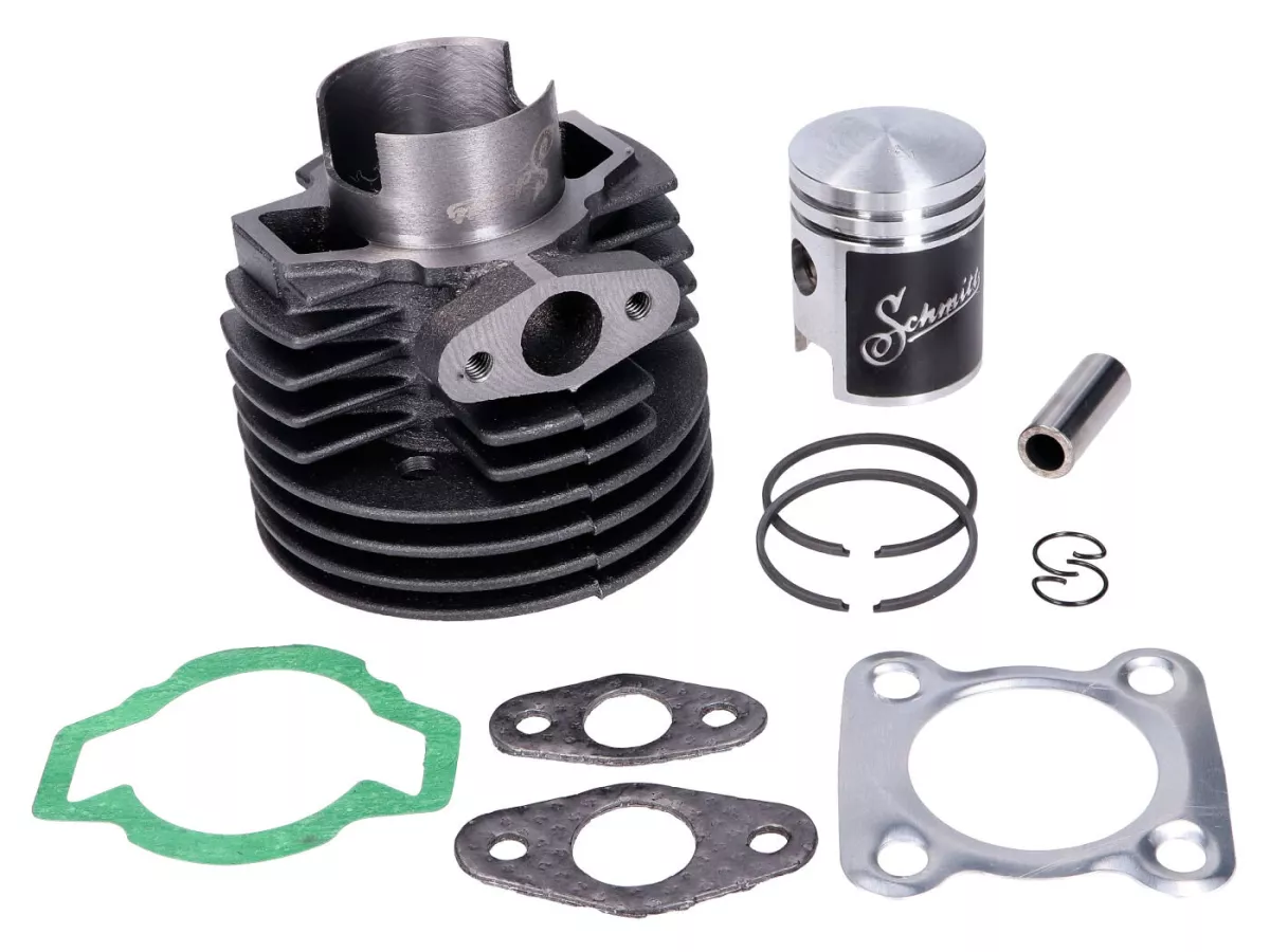 Schmitt Grauguss Zylinderkit mit 60ccm und 40mm Bohrung passend für Kurbelwellen mit 12mm Kolbenbolzen. Dieser Sport Zylinder passt auf Gebläse gekühlte Puch Moped wie MS50, MV50 u.a. mit 2, 3, oder 4 Gängen (nicht R- oder M-Motor). Im Lieferumfang ist ein 2-Ring-Kolben mit einer speziellen Molybdänbeschichtung enthalten. Die besonderen Gleiteigenschaften dieser Molybdänbeschichtung wirken sich positiv auf das Einfahren aus. Kolbenringe, ein Kolbenbolzen (incl. Clips) sowie ein Top End Dichtsatz gehören zum Lieferumfang.